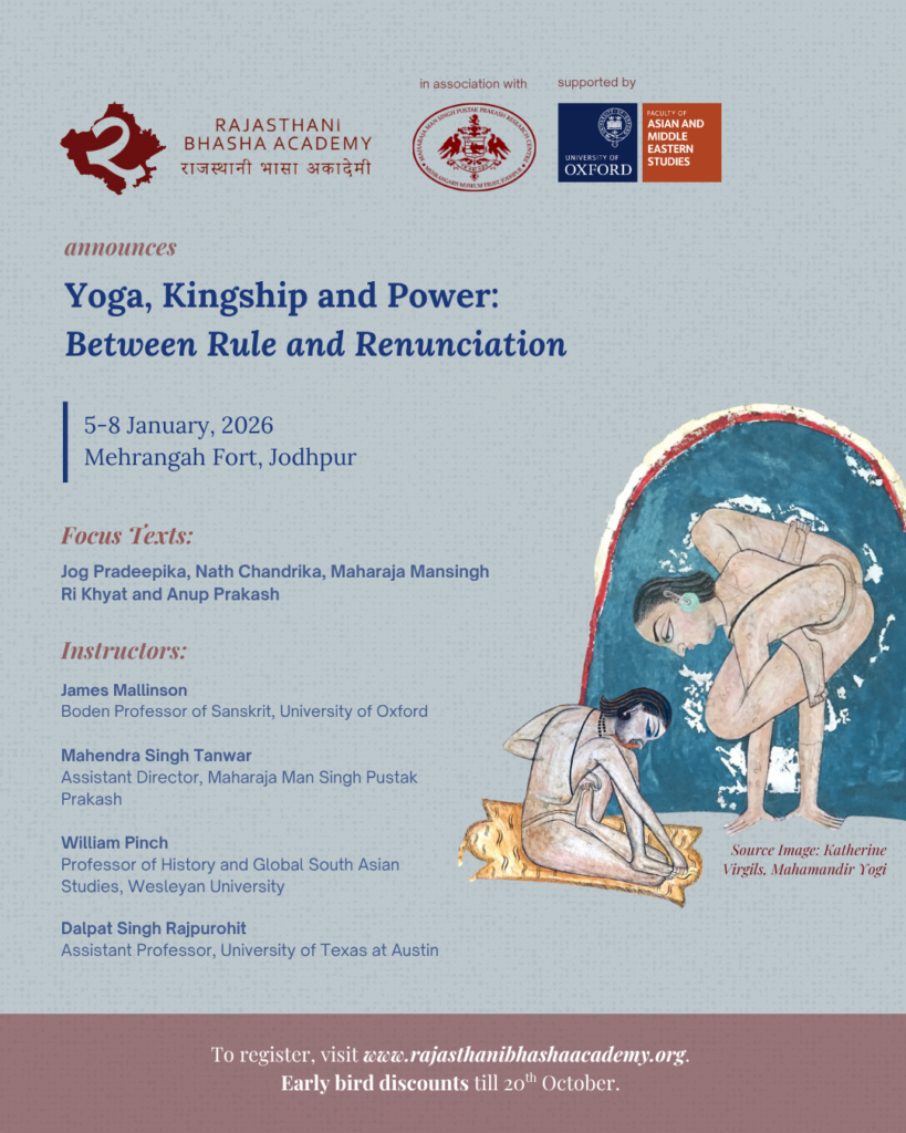The workshop focuses on the intersection of yoga, kingship, and political authority in North India, particularly Rajasthan, during the eighteenth century. This academic event will specifically investigate how ideals of asceticism influenced the concept of kingship by studying the involvement of various ascetic communities, such as the Naths, in acquiring and maintaining royal power. The workshop aims to analyze several specific historical and philosophical texts while examining Maharaja Man Singh’s rise to power, the establishment of a large collection of yoga manuscripts, and the construction of the Mahamandir temple. The four-day workshop will take place at Mehrangarh Fort in Jodhpur and features faculty from institutions including the University of Oxford, University of Texas and Wesleyan University.